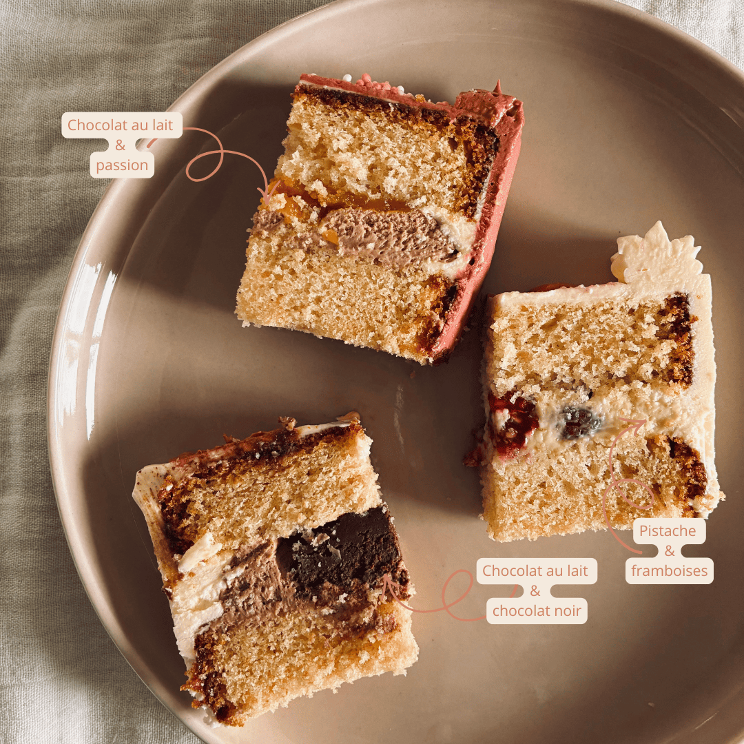 Biscuit moelleux, ganache fondante au chocolat au lait et cœur fruité à la passion.